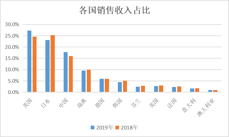 从国家来看,各国销售收入占比排名前三的国家分别是美国、日本和中国,2019年这三个国家的销售收入占比分别为27.3%、23.1%和17.7%,累计占比达到了68.1%。