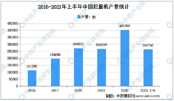 从近几年工程机械的发展来看,挖掘机的发展相对较快,挖掘机已经成为工程建设中最主要的工程机械之一。数据显示,2016-2020年我国挖掘机产量整体增长趋势,2021年1-6月我国挖掘机产量达261740台,同比增长25.6%。