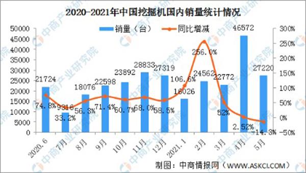 数据显示,2021年5月销售各类挖掘机27220台,同比下降14.3%;其中国内22070台,同比下降25.2%;出口5150台,同比增长132%。2021年1-5月,共销售挖掘机200733台,同比增长37.7%;其中国内176735台,同比增长31.7%;出口23998台,同比增长106%。